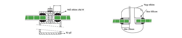 Mép của 2 tấm lợp lấy sáng tiếp giáp với nhau cần phải đặt đúng vào thanh xà gồ, dùng thanh nối nhôm hình chữ H hoặc nhôm phẳng kết hợp Silicon và đính vít để liên kết tấm lợp vào xà gồ. Chú ý nên tạo ra 1 khoảng hở tại vị trí liên kết để cho phép tấm lợp thông minh có thể co giãn.