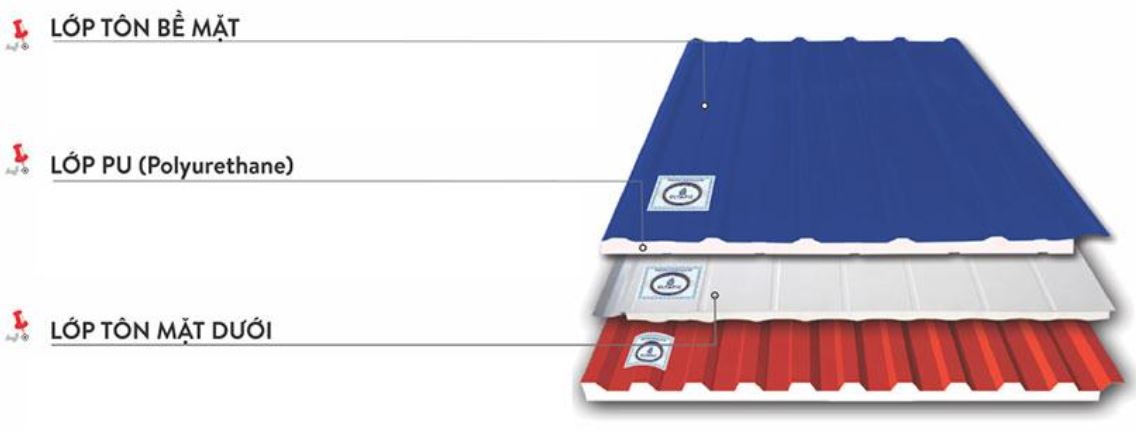 Tấm lợp chống cháy cách nhiệt được cấu thành từ 3 lớp bao gồm lớp tôn lạnh màu Olympic trên bề mặt, lớp cách nhiệt PU và lớp tôn mạ màu lót mặt dưới tấm lợp.