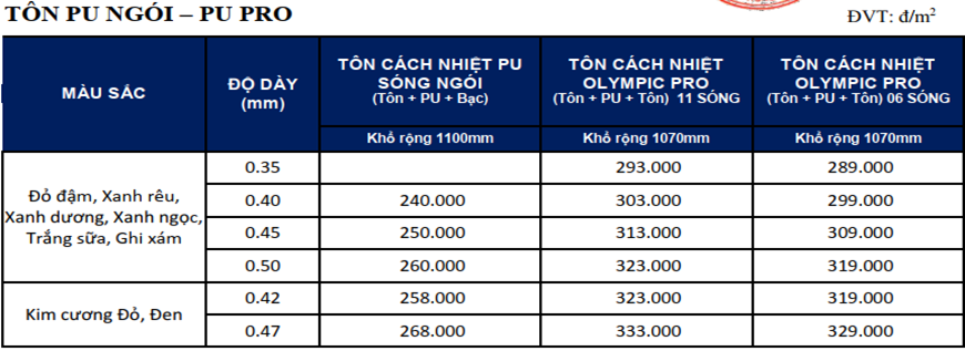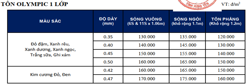 Lưu ý: Trên đây là mức giá niêm yết được cập nhật bởi nhà sản xuất Tấm Lợp Olympic.