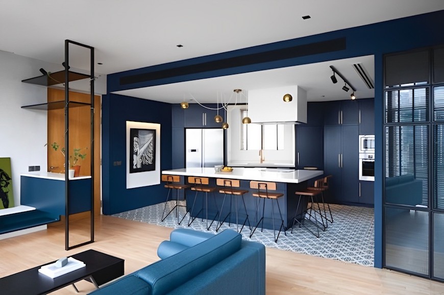 Sự kết hợp giữa xanh dương và vàng tạo nên một căn bếp nổi bật