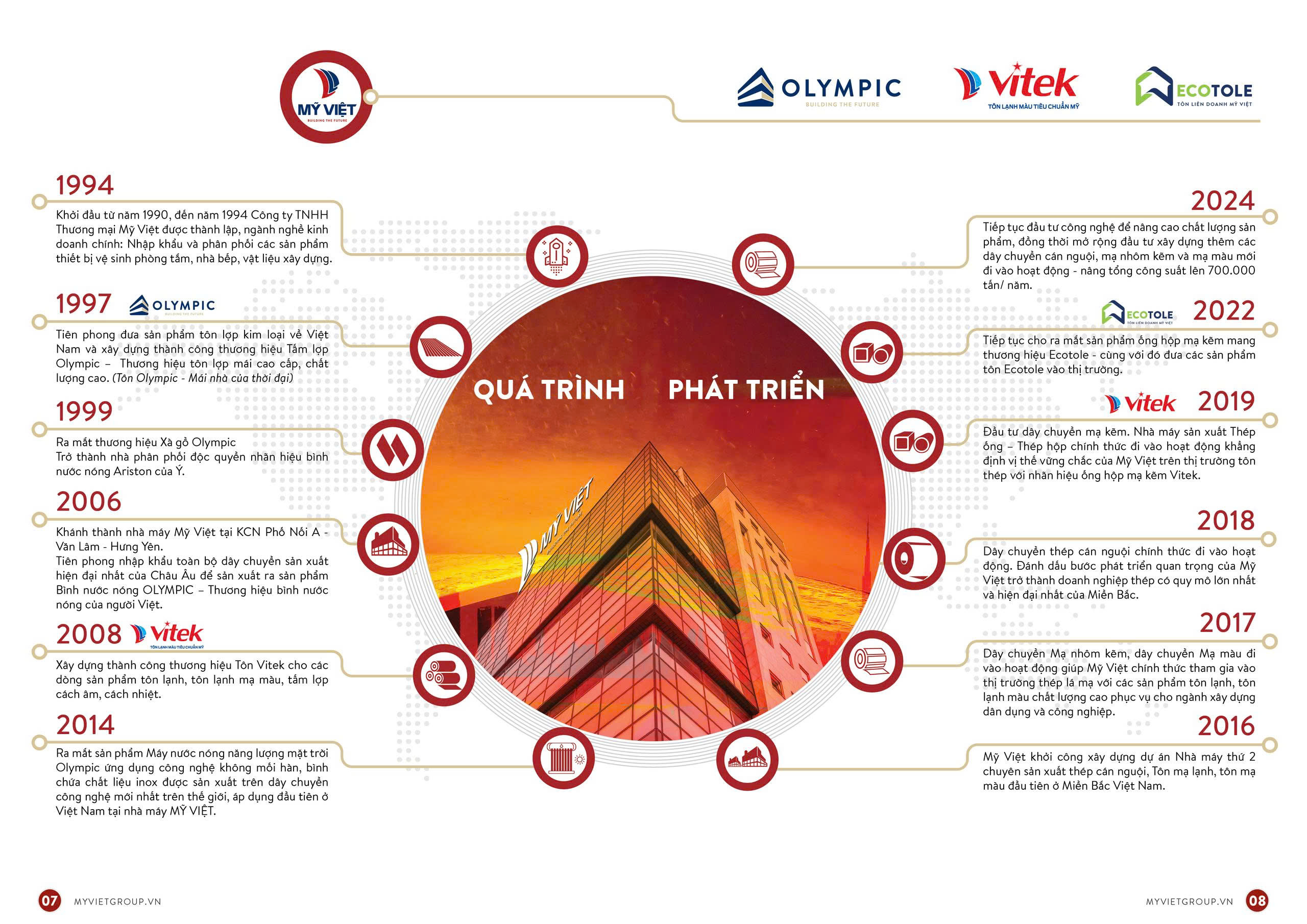 Công ty Mỹ Việt vô cùng tự hào khi đã và đang góp phần không nhỏ trong công cuộc xây dựng đất nước, phát triển nền kinh tế. Bên cạnh đó Mỹ Việt luôn chú trọng tới sự phát triển bền vững, đóng góp cho an sinh xã hội và bảo vệ môi trường. Đây cũng chính là lý do Tôn Olympic nhận được sự yêu thích, tin tưởng của người tiêu dùng trên mọi miền Tổ Quốc, xứng đáng với danh hiệu “Hàng Việt Nam chất lượng cao”, “Doanh nghiệp Vàng”.