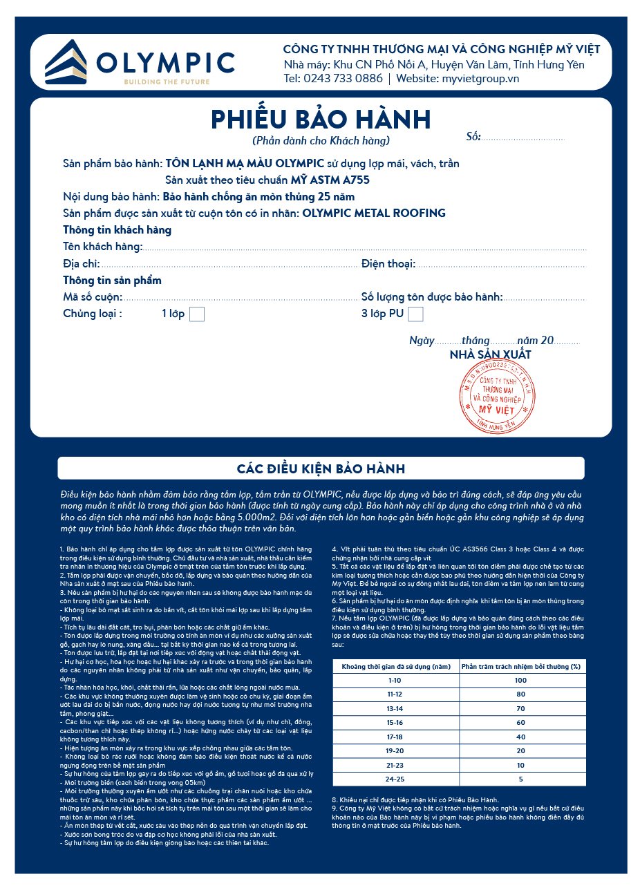 Tôn Olympic chính hãng luôn đi kèm phiếu bảo hành với thời hạn bảo hành lên tới 25 năm. Đây là yếu tố quan trọng giúp khách hàng được đảm bảo quyền lợi trong suốt quá trình sử dụng. Do đó, sau khi mua hàng, bạn nên kiểm tra kỹ phiếu bảo hành, tem xác nhận và hóa đơn mua hàng để tránh rủi ro khi cần bảo hành sau này.