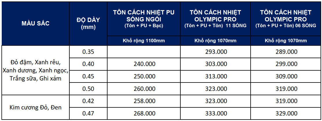 Bảng giá tôn cách nhiệt Olympic Bạc (PU2): ĐVT: đ/m2