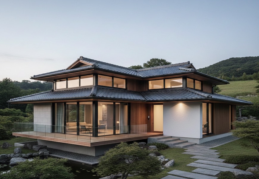 Mái Nhật với độ dốc vừa phải, mở rộng ra các hướng rất phù hợp với nhà chữ L. Sự kết hợp này tạo nên vẻ đẹp thanh thoát, tinh tế. Màu mái thường được ưu tiên là xanh đen hoặc xám đậm, tạo cảm giác tĩnh lặng và sang trọng.
