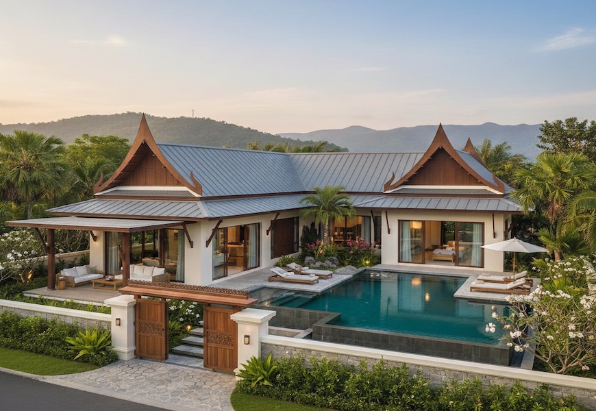 Mái Thái với độ dốc cao giúp thoát nước cực tốt, đặc biệt phù hợp với khí hậu nóng ẩm mưa nhiều tại Việt Nam. Kiểu dáng mái cao ráo này cũng giúp ngôi nhà trông bề thế hơn, thể hiện đẳng cấp của gia chủ.