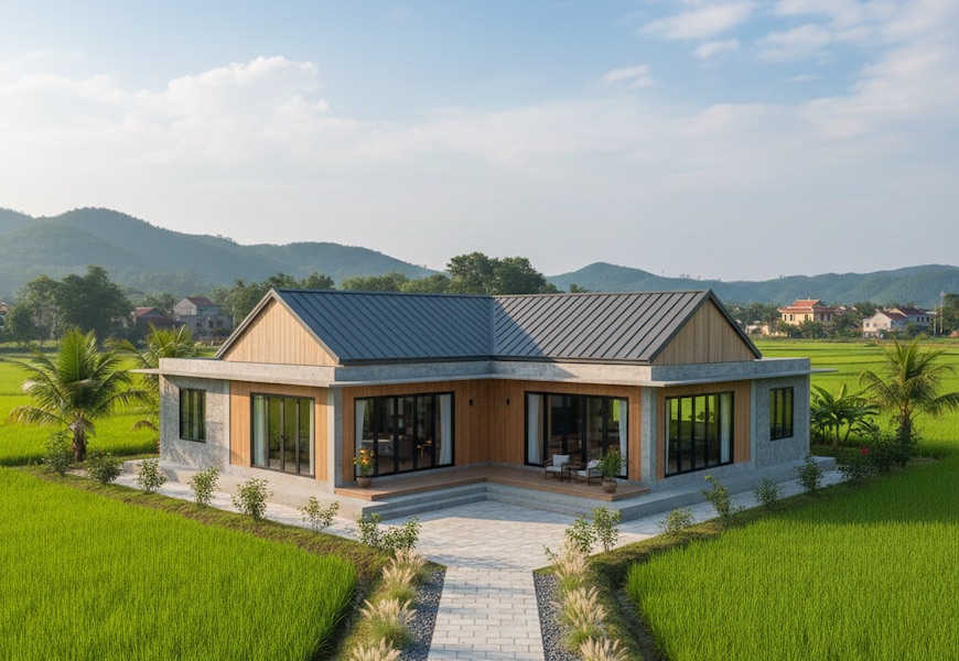 Sự kết hợp giữa nét truyền thống và hiện đại. Những mẫu nhà này thường sử dụng mái tôn màu đỏ truyền thống của Tôn Olympic để tạo điểm nhấn nổi bật giữa không gian xanh mướt của vùng quê, đồng thời tiết kiệm tối đa chi phí xây dựng.