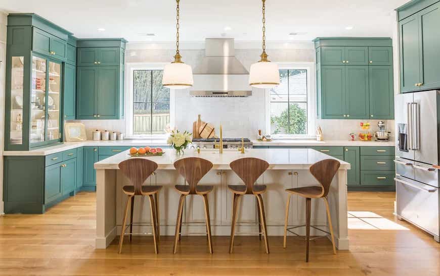 Sự kết hợp giữa gam màu xanh lá và trắng tạo nên căn phòng bếp đẹp mắt