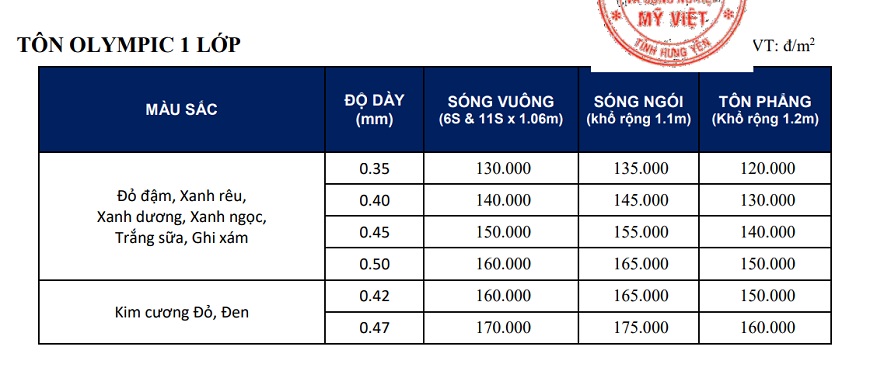 2. Giá cả mới nhất của các loại tôn Olympic là bao nhiêu?