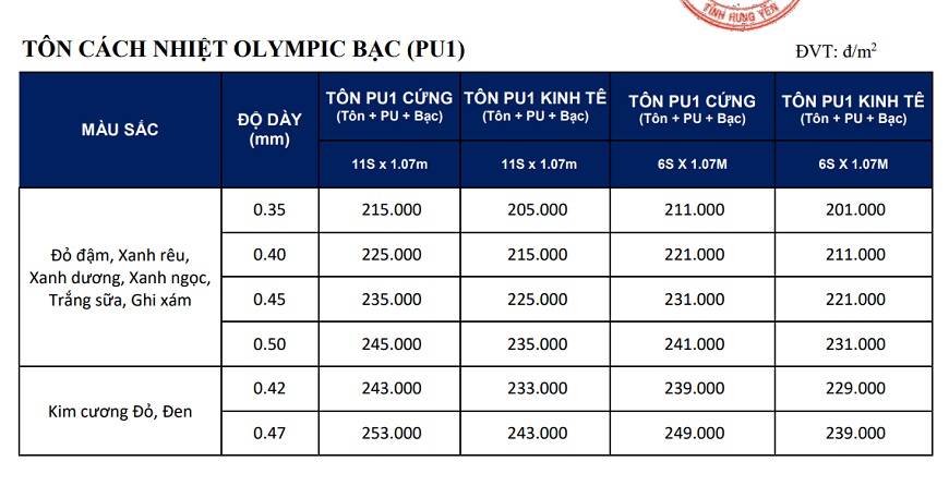 - GIÁ TÔN CÁCH NHIỆT OLYMPIC LOẠI PU 1
