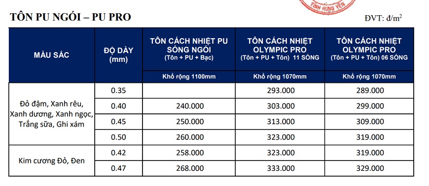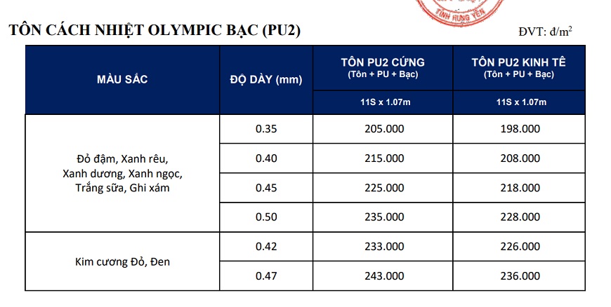 - GIÁ TÔN CÁCH NHIỆT OLYMPIC LOẠI PU 2