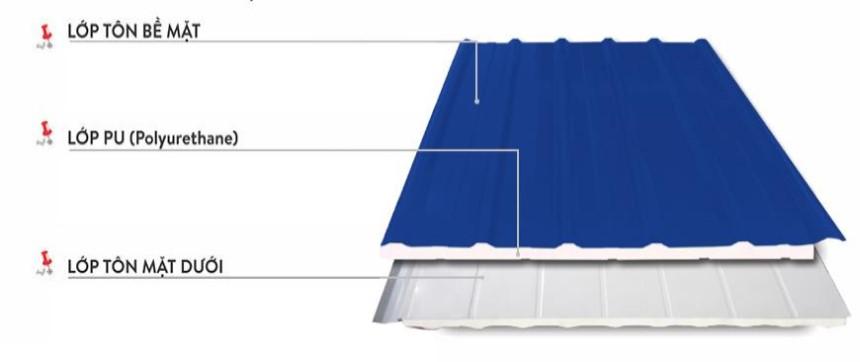 Lớp PU cách nhiệt nằm ở giữa: PU (Polyurethane) có độ dẫn nhiệt thấp và khả năng chịu được nhiều loại hóa chất khác nhau, do đó rất phù hợp với các công trình nhà kho, xưởng xây dựng. Bên cạnh đó, trong thành phần của PU không chứa chất gây hiệu ứng nhà kính CFC nên bạn có thể yên tâm rằng vật liệu này hoàn toàn thân thiện với môi trường và an toàn cho sức khỏe của gia đình mình. Tuy nhiên, giống như đa số những vật liệu cách nhiệt khác, PU lại rất dễ bắt cháy, khi bắt lửa PU thường cho phép đám cháy lan nhanh và sản sinh ra khói bụi độc hại.