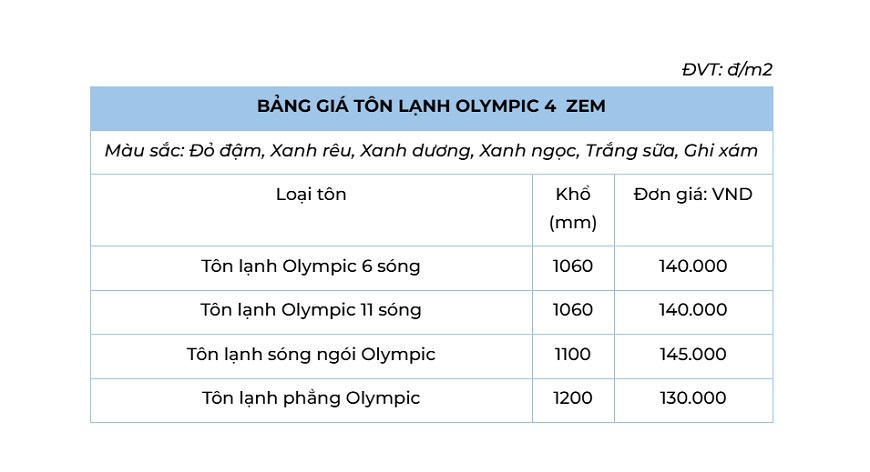 3. Báo giá tôn lạnh Olympic 4 Zem chi tiết nhất